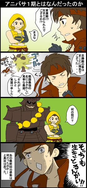 2010/09/21 Category : ├ アニバサ アニバサ11話 一度描いた記事がエラーで投稿できてなくて「おのれ、SHINOBIいいぃぃぃぃぃぃぃ!!」ってなりました。「一時保存しました」とかいってたくせに、全然保存できてねぇぇぇぇぇぇ!!なぜ裏切る!で、何の話をしてたかというとですね、アニバサ11話です。今週もでるとは思わなかった!喋らなかったけど!でも、なかなか喋ってくれないってのも、焦らしプレイのようで逆にそそります。それにしても、色んなところで既に言われていると思いますが、幸村&伊達が秀吉を倒しちゃったら、3フラグがたたないんですよね。しかも、いえやすが寝返って秀吉やっつけるのを手伝う、みたいな展開になったとしても、3につなげるのにちょっと無理が出てくるし・・・。かといって、ここまで盛り上がっておいて最後は幸&伊達を差し置いていえやすが一人でおいしいとこ全部持ってきましたなんてのもそれこそどうかと思うし(笑。そんな事になったら、視聴者までもがいえやすの敵になっちゃうぜ!そうでなくても、3では色んな人に恨まれてるのに!それか、成長家康と三成は、単なるファンサービスで、別に3期やるフラグとかではないんろうか。それはそれで別によいんだけどね。むしろ、サービスおいしいですありがとう。それかそれか、アニバサは伊達幸村が主人公というコンセプトを貫くなら、家康さんが3期のラスボスか・・・?あ、なんかそれ一番ありえそう。っていうか、Basara3の主人公は家康、と見せかけて実は家康はラスボスなんじゃ…って思ってるの、わし。タグ【アニバサ】【漫画】