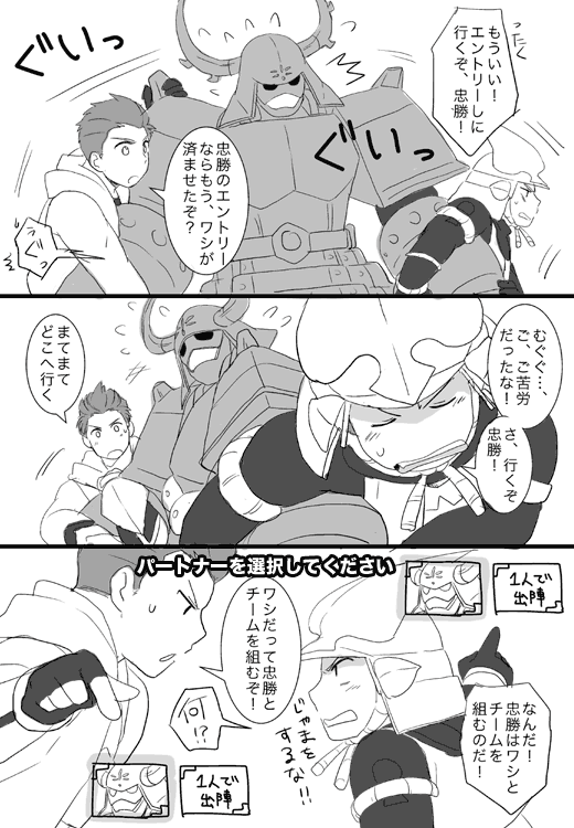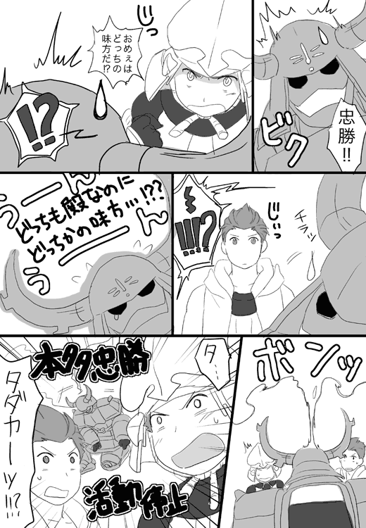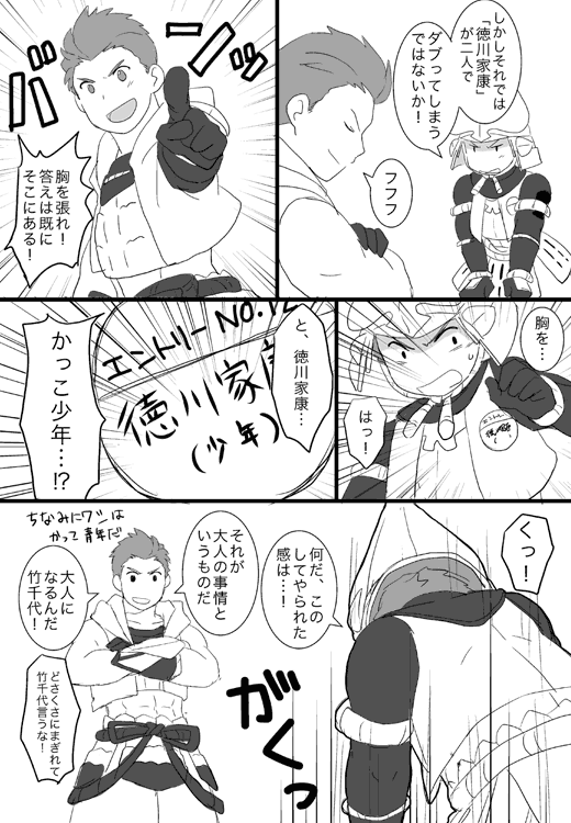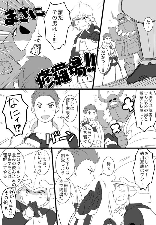 2011/10/30 Category : ├ 漫画 【漫画】スパーク無配鉄壁 スパークで無料配布したコピ本まんがでした。午後からしか配れませんでしたが…。宴出る前にクロニクルネタ!と思い。 一冊目のセルフパロ的なのと、クロニクルネタと。90年代同人誌のノリを目指した。既に忠勝総受けやないか!といわれて確かに…!って思ったけど、よく考えたら取り合ってるのは同一人物ですが。家康大と小を一緒に描くと、どうしても小が常にプンプンしてしまいます。でも描くの楽しい。 クロニクルだと大のパートナーに忠勝つけても指令飛ばすのは小なのでなんかおもしろいです。いえやすさんは後ろから飛んでくる指令の声聞いて「やれやれ」って思ってそうな。その分戦いに集中できるからいいけど、実はちょっと自分で指示出したいとか思ってたりとか。 PR Comment0 Comment Comment Form お名前name タイトルtitle メールアドレスmail address URLurl コメントcomment パスワードpassword