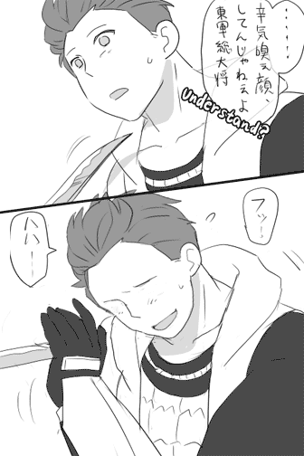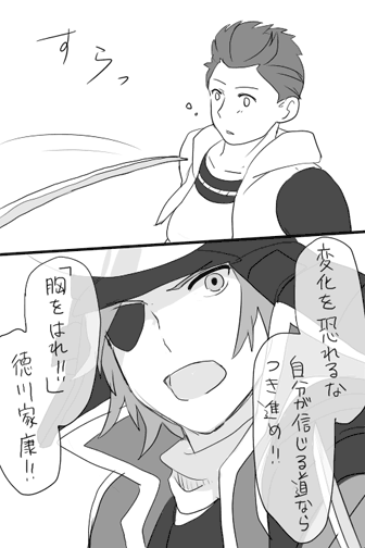 2010/10/24 Category : ├ 漫画 【漫画】独眼竜といえやす2 ちょっと長いので隠します。続きは↓から 胸を張れってのは家康の言葉を借りて。独眼竜なら家康を叱ってくれそう。なんとなく、伊達は冷静に人を評価しそうです。伊達と家康の関係は、友達ではなくあくまで”同盟者”なイメージ。対等な同盟者だからこそ言えることもあるし見える事もあるかななんて。あんたがしっかりしてくれないと、オレが困るんだよ!みたいな。家康も、そんな伊達が味方に付いていてくれるのがすごく頼もしく思ってそう。うちの家康は全然落ち込むことをやめれてない(笑いえやすは自分の成長を喜んでる一方で、周囲から変わったとか変わってないとかいわれる事を結構気にしてるんじゃないだろうか。本人は、変わってないって思いたいし、やっぱり根本的な部分は変わってないんだろうけど、それでも全く同じままなわけはないよなぁ、という結論に達しました。私が。ま、ぜーんぶ妄想なんですけどね!(言っちゃった)たぶん、言われなくても胸張ってるだろうしな、家康は。うーんそれにしても、言いたい事がありすぎて頭の中ぐるぐるした結果、アウトプットは説明不足になってしまうなぁ。反省。 PR Comment0 Comment Comment Form お名前name タイトルtitle メールアドレスmail address URLurl コメントcomment パスワードpassword
