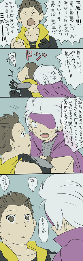 2010/10/11 Category : ├ いえやす 【漫画】あいでんてぃてぃ 家康さんの基本ルートがとても三成だったので。毎日、いえやすとは何なのかを考えすぎて余計にわけがわからなくなってきた。あと一コマ目描いてる途中で「三成」がゲシュタルト崩壊した。全然関係ないんですけど、今、塀の中の中学校見てるんですけど、思いがけず感動してしまったので終わるまでお風呂に入れない。Oh,shit!!私も明日からまた仕事頑張るぞっと・・・。