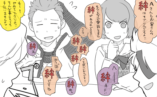 2011/05/16 Category : 日常/拍手返信 【拍手返信】きずなトーク 確か忘年会の時ぐらいに有った事を日記に書こうとして落書きしたけど、結局使わなかった画像が出てきたのでサルベージ。忘年会中、突如始まったまさかの絆トークに内心なぜか焦りました。そんな…いえやすさんなみに絆連呼しないで!いやいえやすさんでも連呼はしないぞ!そのあともそのテーブルではしばらくネタで何かあるたびに「絆」でした。そうだ!絆の力だ!!(やけくそ)あ、あと、裏に一個追加しました。 >拍手のお返事をば~!