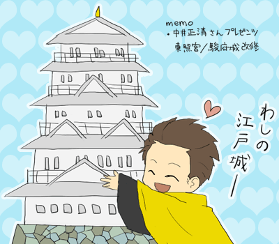 2011/01/23 Category : ├ いえやす いえやすさんの江戸城 いえやすさんに江戸城を建城・献上したいそういや、バサラいえやすさんは江戸にちゃんといくのかみたいな話を前してたんですけど、よくよく考えてみたら北条さんがご健在じゃないか。でも小田原の役はあったんだよね?あと、無血開城うんたらみたいな事を北条軍が言っていたような言っていなかったような。何だかその辺りがあんまりよくわかってないぞ。でもとりあえずやっぱり江戸幕府は無いのかなー。いえやすさんが関ヶ原後に北条さんから領地没収でもすれば別なのかもしれませんが…。そんな…。あの花見はそのためだったってか?腹黒いにも程があるぜ…。というのは個人的にあってほしくないので、三河幕府の方向で推して参ろうかと思います。首都は静岡?そんなこんなでバサラいえやすさんには江戸城関係ないかもしれないけど、今日TVの特番で江戸城を築城した大工さんのお話が紹介されてまして家康公の「富士山みたいなお城がいい!」っていうご所望を見事聞き入れて立派なお城を作って、大御所様もいたくご機嫌だったって話をやってました。その大工さんは徳川とはわりと懇意で、駿府城の改修とか、東照宮も建築した方らしいです。あと、合戦の陣中でも何か作ってたって言ってたような…、何だったかな、忘れてしまった。公私ともに家康公とお付き合いがあったってのを聞いて滾りました。萌えたので、自分のメモ用に語っておく。まぁとにかく、いえやすさんにも富士山みたいな立派なお城を建城・献上したくなったわけです。いえやすさんの喜ぶ顔が見てぇんだ!