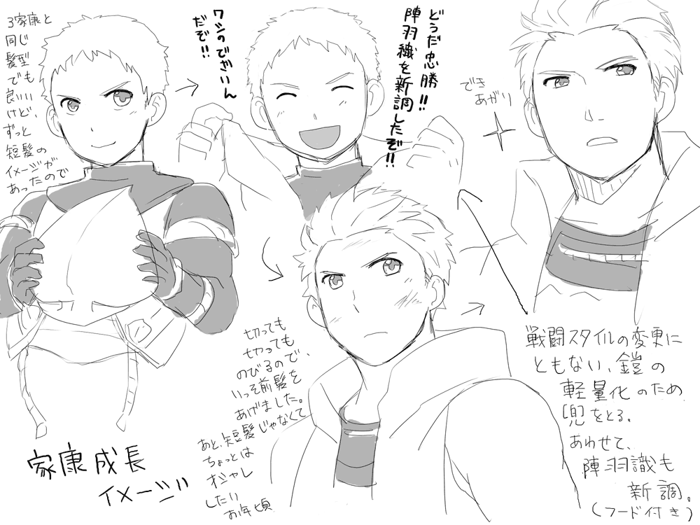 2010/12/13 Category : ├ いえやす いえやす成長過程妄想 クリックで大きくなります。家康成長過程妄想↓髪型に関する妄想・兜の下は短髪(これは3以前に短髪イメージを持ってたのの名残りでしかないですが…) でもアニメのいえやすさんの襟足はだいぶ短そうだったので、坊主でもいいかもとも思ってた。・その後、短髪にするのををやめて、前髪を上にあげることに。 →短髪だと幼く見えちゃうとか、気が付いたらすぐ髪がのびてくるからとか、 三成が毎日髪の毛セットしてるのに感化されたとか、ちょっとはおしゃれをしたいお年頃とか…衣装に関する妄想・戦闘スタイルの切り替えに合わせて、敵の懐に飛び込む身軽さが要求されるようになったので、兜を取って鎧も軽量化を図る。・陣羽織は、集中したいときのためのフードをつけた特注品。・背中の「羊歯前立て模様」の真ん中の顔みたいなのの実際の由来は知らないけど、 バサラいえやすさんは忠勝を記号化してるつもりだといい。そんな感じで色々細かく妄想してます。あと、ずっと気になってるんですが、バサラいえやすさんの居城って3でも浜松城だよなたぶん…。江戸にいなくね?江戸幕府ちゃんとできるのか?人質時代に家臣がお留守番してるのは岡崎城で、人質解放後は岡崎に帰参、その後2の忠勝シナリオまでには浜松城に移動って感じかと妄想してるけど、江戸にはいついくんだろうか…。いえやすの三河への愛着度を考えると、どう考えても三河幕府…。TOKYO BASARA終了のお知らせ。その編の妄想もまたゆっくり整理したい。
