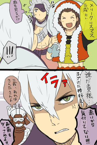 2010/12/25 Category : ├ いえやす 【漫画】いえやすさんた 黄色い事はアイデンティティ「三太?三太とは何者だ、刑部」「一年に一度のみ仕事する道楽爺よ。三成、欲しい物を伝えてみよ」「戯けるな。私が欲しいのは家康の首のみ!!」「うーん、いかにサンタといえど、それはちょっとやれんなぁ」関ヶ原のクリスマスは「メリークリスマス(地獄で会おうぜ!)」お返し
