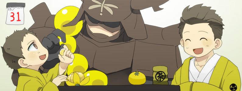 2010/12/31 Category : ├ いえやす 来年もよろしくな、忠勝! 徳川主従の大晦日。忠勝の指は大きくてみかんを潰してしまうので、いえやすたんがむいてあげます。ほっこりほっこり。クリスマスのまま正月越すのもあれなんで、ちょっと急ごしらえ。コンセプトは大晦日限定TOPだけど、正月TOPできるまではこれでしょう。鉄壁主従がぬくぬくしながら年を越しますように。